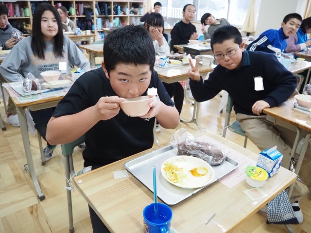 今日の給食は、コンソメスープ、コーンサラダ、肉だんご、ココア揚げパン、はちみつレモンゼリー、牛乳で、卒業を控えた6年1組のリクエスト献立となっていました。