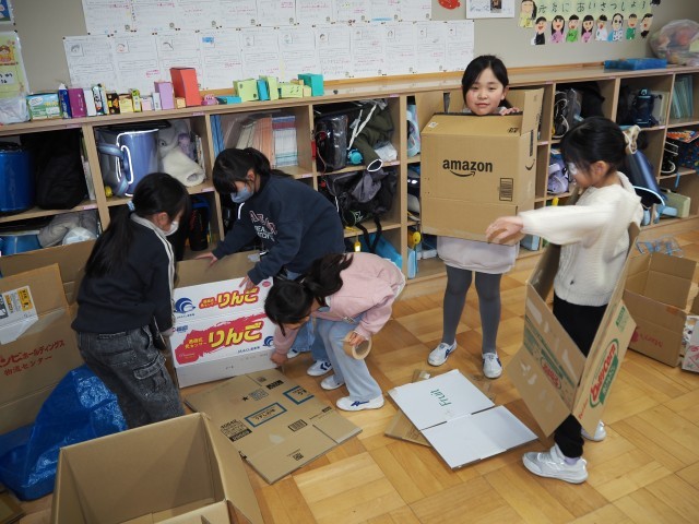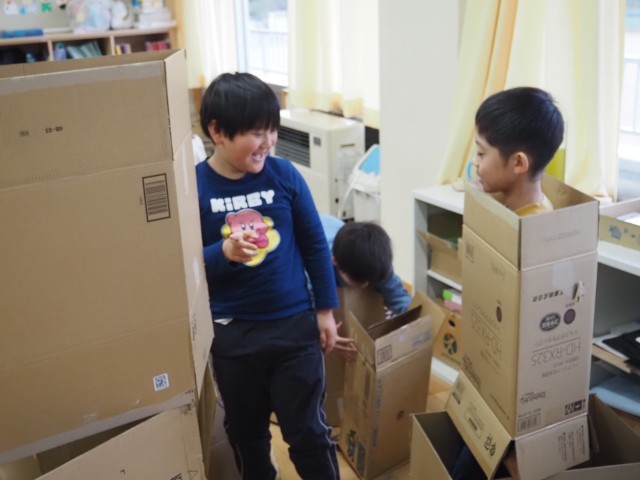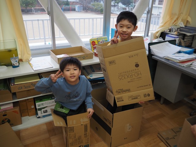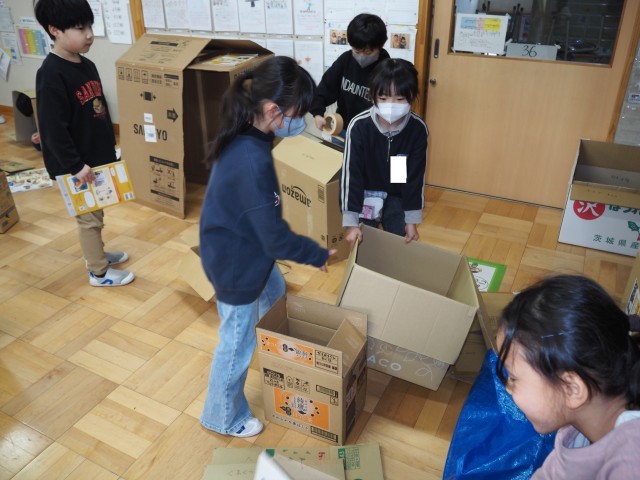 2年1組は、図画工作で「だんボールに入ってみると」の制作活動を行っていました。家庭科持ち寄ったたくさんの段ボールを使ってに実際に入ってみて、どんなことができるか考えました。友達と協力しながら、楽しそうに活動していました。