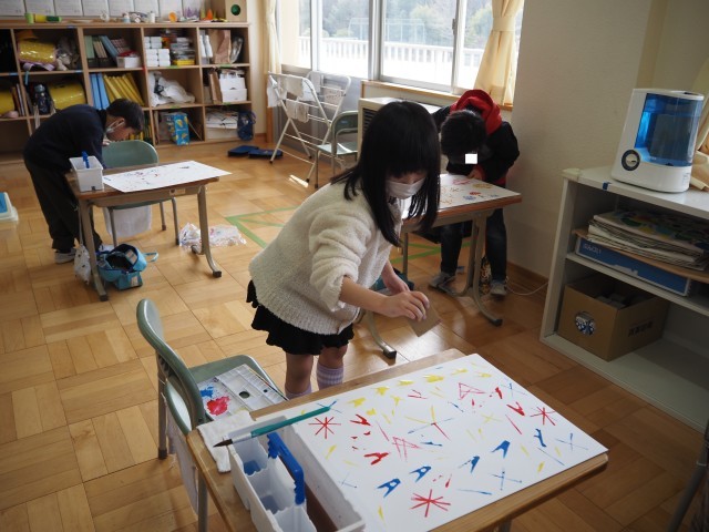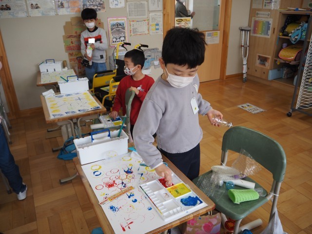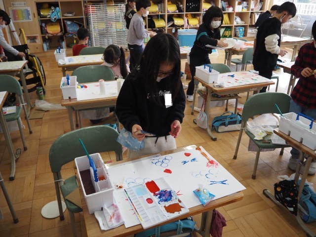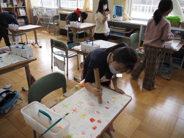 1年2組は、図画工作で「うつしたかたちから」の制作活動を行っていました。段ボールや丸芯、洗濯ばさみ、いろいろな材料に絵の具をつけてスタンプのように画用紙に押して作品をつくりました。いろいろな形を組み合わせながら、発想を豊かに工夫しながら作っていました。
