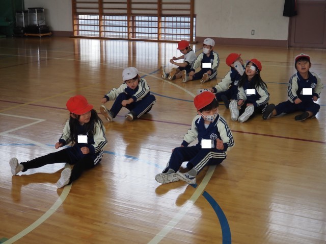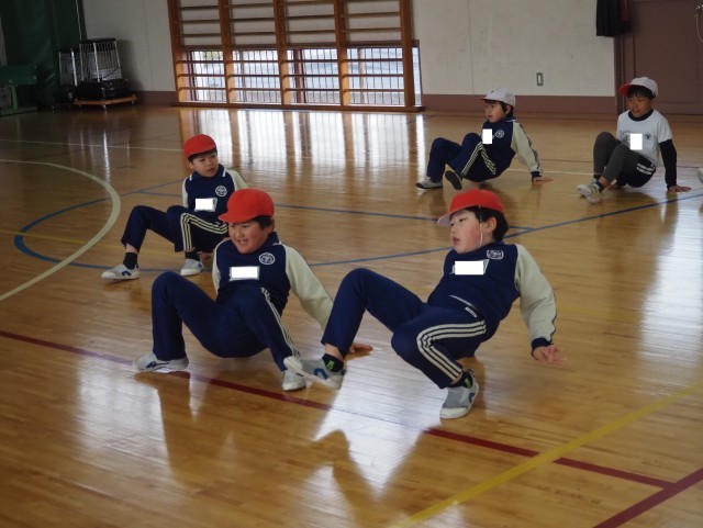2年1組は、体育を行っていました。多様な動きを取り入れながら、準備運動を進めていました。腰を下ろしたまま、腕の振りで前に進む運動やクモ歩きなど楽しそうに運動に取り組んでいました。