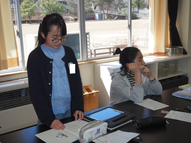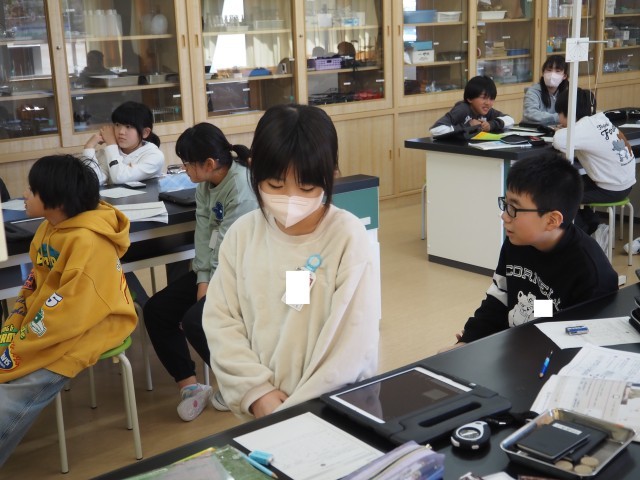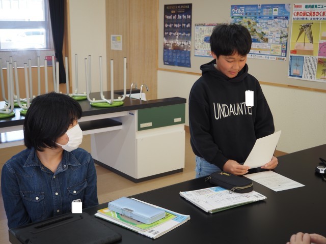 5年2組は、理科で「ふりこのきまり」の学習を行っていました。ふりこの1往復する時間は、振れ幅(15度、30度、45度)で変わるか実験した結果をグループの代表が発表していました。どのグループも振れ幅が変わっても、1往復する時間に変化がないことを発表していました。