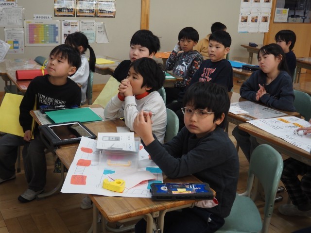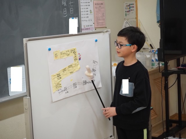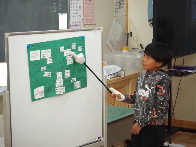 2年1組は、生活科で「2年生せい長すごろく」の発表会を行っていました。前の時間に仕上げたすごろくをみんなに発表します。自分の成長の様子が伝わるように発表していました。聞き手も友達がどのように成長したのかを真剣に聞いていました。