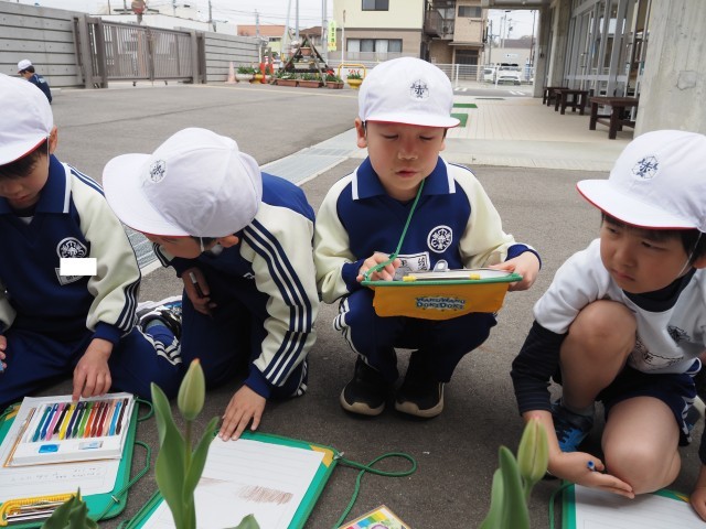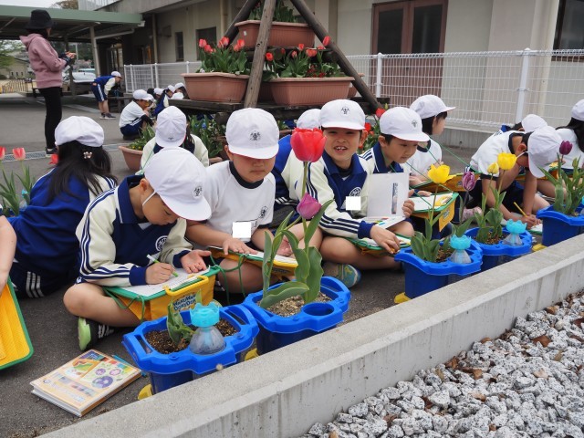 2年1組は、生活科でチューリップの観察を行っていました。大きく成長したチューリップをスケッチし、気づいたことを書き加えていました。