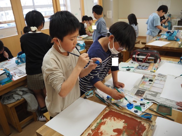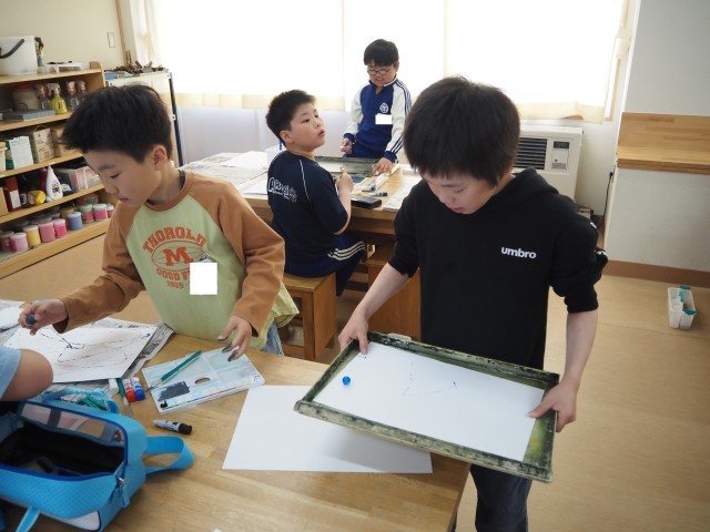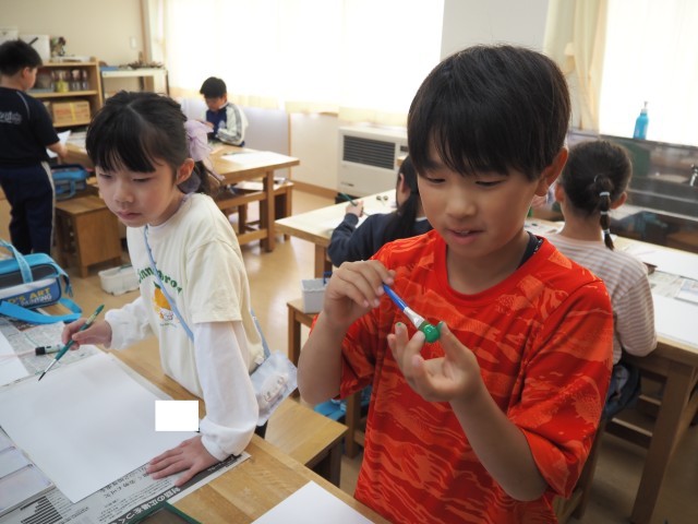 4年2組は、図画工作で「見つけよう感じよう 形と色のいい感じ」の製作活動を行っていました。いろいろな方法を使って、試しながら自分だけの模様の紙づくりに挑戦していました。ビー玉に絵の具をつけ転がしたり、ブラシで絵の具を散らばらせたりと工夫しながら取り組んでいました。