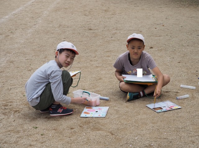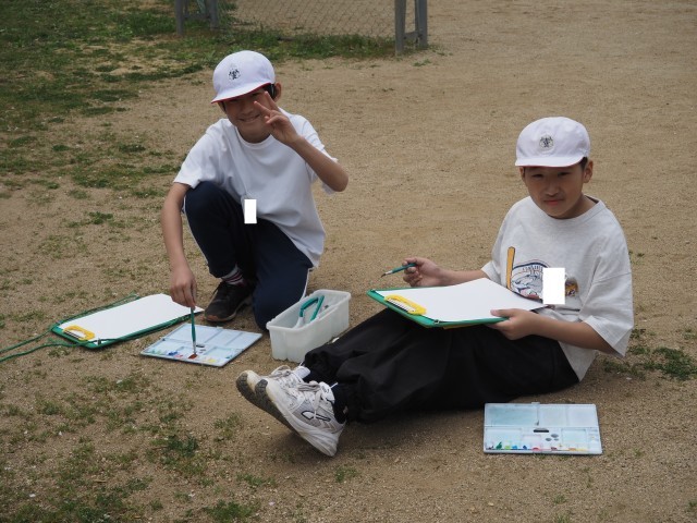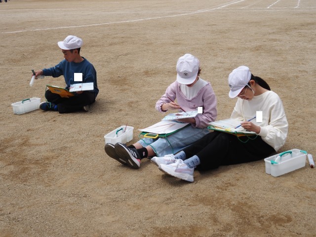 6年1組は、図画工作で「絵具スケッチ」の製作活動を行っていました。校庭に出て、自分が描きたいものを選び絵の具を使って表現します。どんな作品が仕上がるのでしょう?
