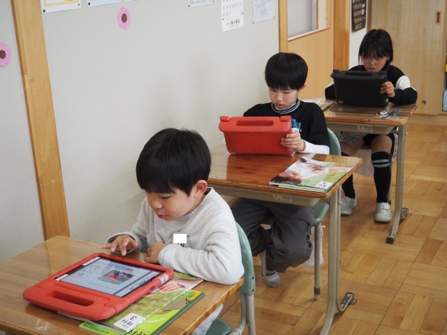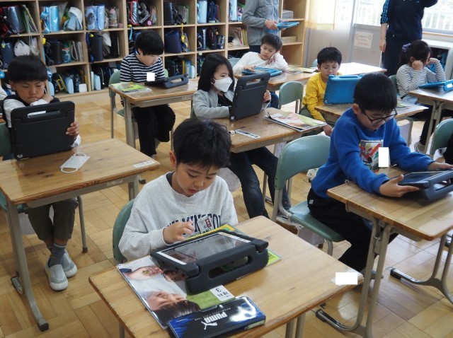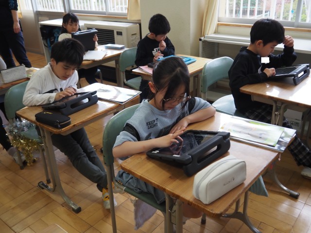 3年1組は、理科で「春に見られるいろいろな生き物」について学習していました。タブレットを活用し、自分が見つけた生き物をみんなで共有していました。