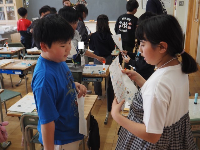4年2組は、ジリアン先生と外国語科活動の学習を行っていました。天気を聞いたり、どんな活動をしたかを聞いたりする活動をペアを変えながら行っていました。
