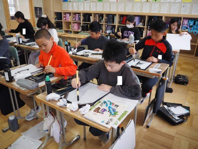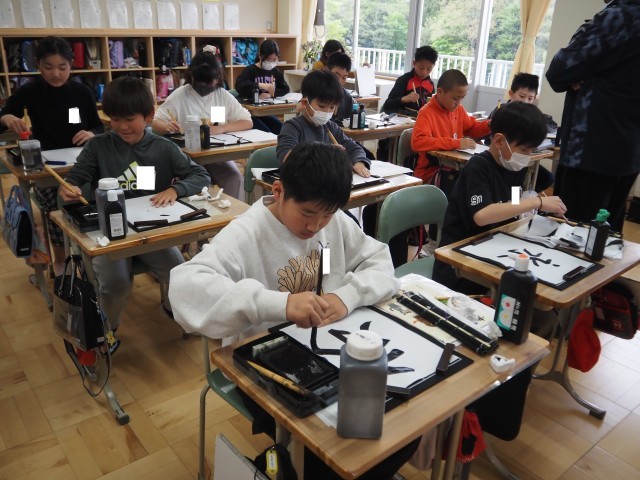 6年1組は、書写の学習を行っていました。今日は、「永」の字を書いていました。書いていく中fで、筆が回らないようにすることが大事であることを学び、自分でチェックしながら書き進めていました。
