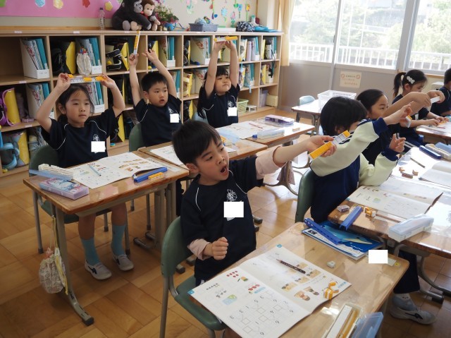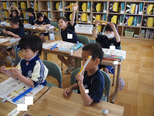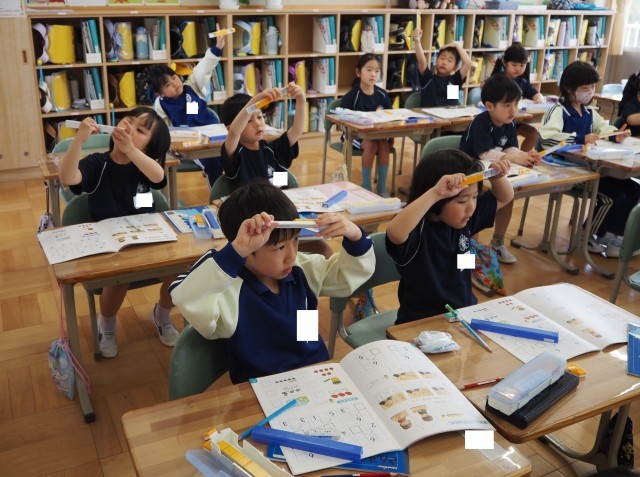 1年1組は、算数「なかまづくりと かず」の学習を行っていました。算数ブロックを使い「6」の数の構成について学んでいました。算数ブロックを使いながらいくつといくつから成り立っているかを考えていました。