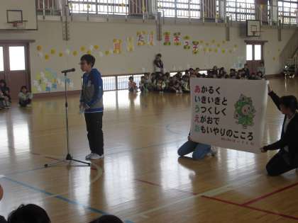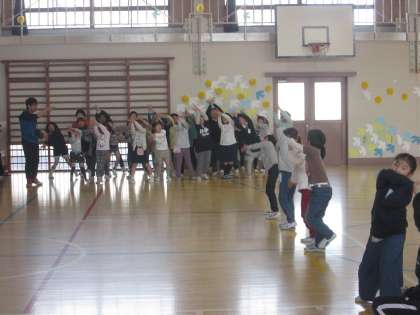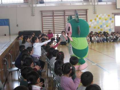 新1年生、54名の「入学おめでとうの会」が行われました。2年生が開会の言葉を担当し、歌とダンスで盛り上げてくれました。6年生の実行委員長のお迎え・お祝いの言葉は、1年生に呼びかけるように話し、とてもすばらしい内容でした。あかりんもお祝いにかけつけてくれました。