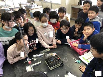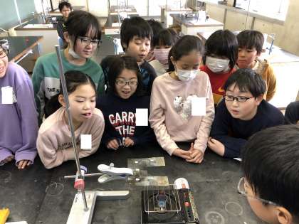 最後は、コの字の金属板をみんなでいっしょに前で観察しながら実験しました。