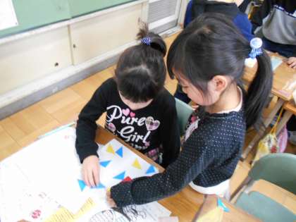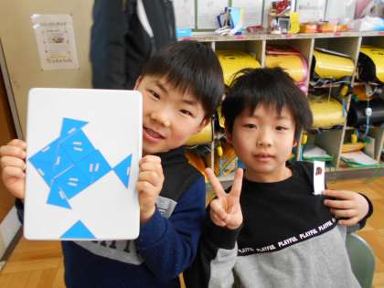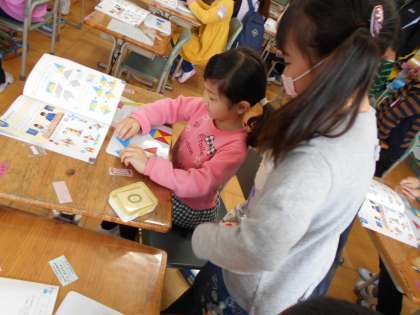 赤木保育所の年長さんが小学校の見学にきました。1年生は保育所のお友達を自分のいすに座らせて色板のやりかたを教えていました。進んでこんなことができるようになっていて、子ども達の成長を感じました。どの子の顔もおにいさん、おねえさんでした。保育所のお友達も笑顔いっぱいでした。