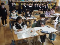 今日給食は、ごはん、かつおとジャガイモのごま味噌和え、小松菜のおひたし、きのこのすまし汁、牛乳、柏餅で「端午の節句」メニューとなっていました。