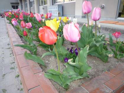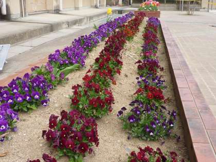 今、学校の花壇は、チューリップとパンジーの花が満開です。