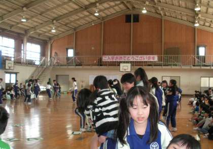 「1年生を迎える会」のアトラクションはゲームと鼓笛です。始めに、6年生と1年生がペアになって「あいうえ学校カルタ」を行いました。『きょうしつ』や『こくご』などの学校に関係するひらがなのカードを、1年生が6年生にサポートされながら拾って数を競いました。