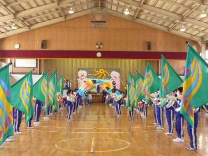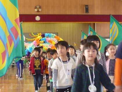 5・6年生による「校歌」の鼓笛演奏の中、1年生退場です。エスコートは2年生です。アーチとカラーガードの花道を1年生の手をひいて歩く2年生は、しっかりしたお兄さん、おねえさんでした。