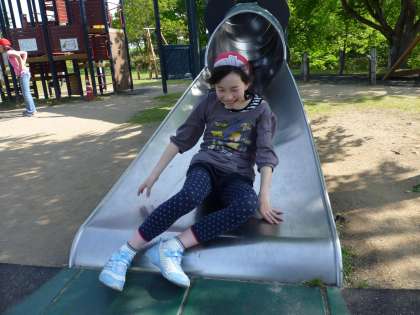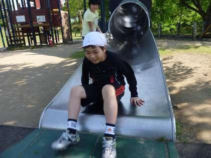 「足長・手長」の滑り台は、右腕がジャングルジム、左腕が筒状の滑り台になっています。長い腕から誰が滑ってくるのか分からず、ちょっぴりスリリングです。