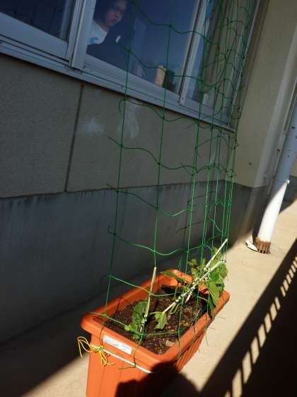 6/6(月)、吉田先生にお願いして、ネットを張っていただきました。ぐんぐん成長して、グリーンカーテンの役目も果たしてくれることでしょう。