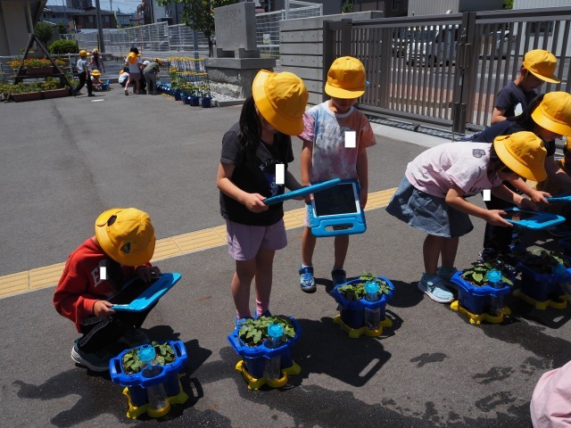 5つの種植えをしてから、水をあげてお世話してきた朝顔も芽を出し成長し始めました。さらに成長するようにと、今日は間引きを行いました。間引きをする前に、タブレットで朝顔の成長の様子を写真に撮り記録しました。上手に撮影することができたようです。これからタブレットを使い機会も増えてくることと思います。