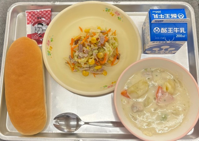 今日の給食は、コッペパン 牛乳 大豆チョコクリーム ハムサラダ ホワイトシチューでした。ホワイトシチューの中に、「白花豆」のペーストを入れました。白花豆は、「低脂質高たんぱく」の食品です。ビタミンB1や食物繊維が豊富です。給食では、この白花豆をやわらかく煮てペースト状にしたものをシチューに入れています。洋風の料理に加えても、クセがなく豆類の摂取もできて栄養価が上がり、おいしく食べることができます。ご家庭でも是非ご活用ください。
