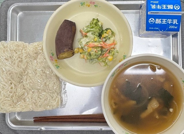 今日の給食は、五目うどん 牛乳 ふかしいも ブロッコリーサラダでした。今週は地産地消給食週間です。今日の福島県内産の食材は、牛乳、とり肉、油揚げ、ブロッコリー、きゃべつでした。地域で生産された食材をその地域で消費することを地産地消といいます。食材の輸送にかかる費用が削減されたり、新鮮な状態で食べることができたりと、いいことがたくさんありますので、ぜひ食べてみてください。
