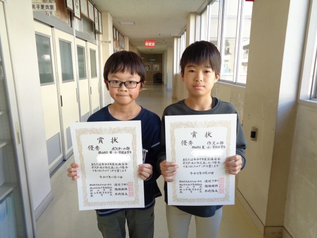 夏休みの課題の一環として取り組んだ「交通安全母の会・交通安全ポスター・作文展」で優秀な成績をおさめた児童の皆さんに賞状が届きましたので、お昼の全校放送で伝達を行いました。