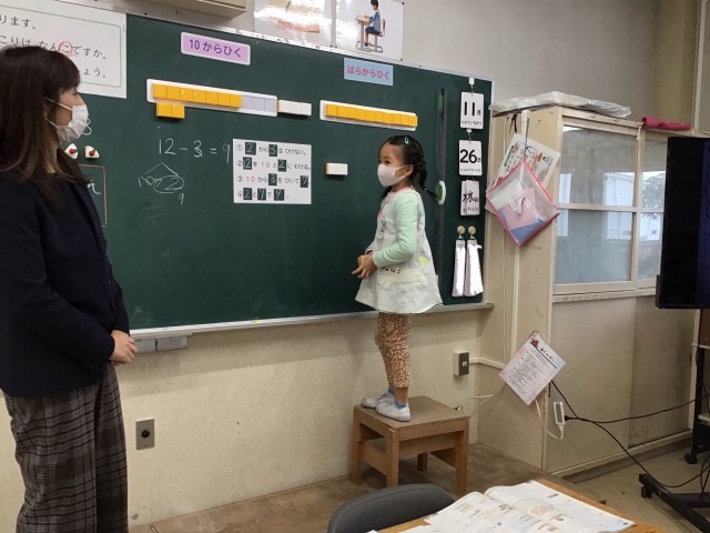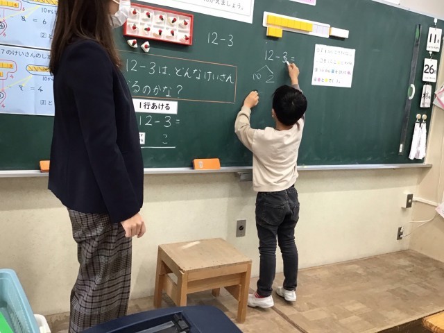 1組でもひき算の授業研究を行いました。「10からひく」計算方法だけでなく、「ばらからひく」方法もみんなで考えることができました。友達の話を真剣に聞いて、学びを深めています。