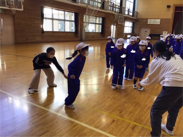 今日は、運動委員会が企画した長縄キャンペーンの日でした。1年生はまだ上手に長縄を跳ぶことができないので、へびに見立てた長縄をまたいだり、「ゆうびんやさんの落とし物」の歌に合わせて跳んだりしました。みんなで楽しい休み時間を過ごすことができました。
