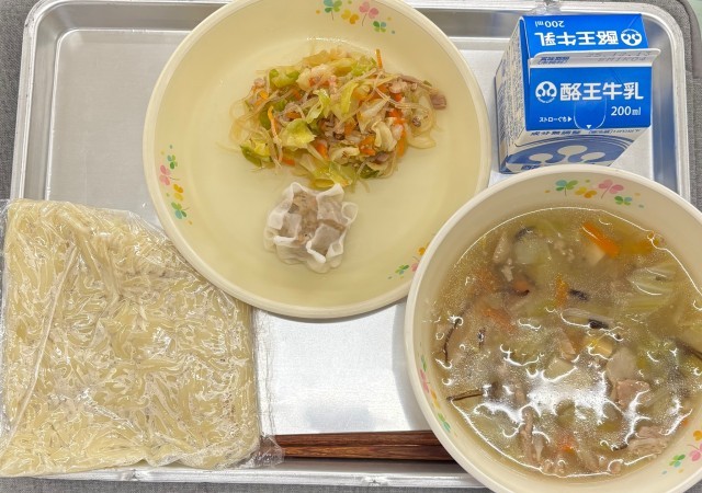 今日の献立は、チャンポンめん 牛乳 しゅうまい 中華サラダでした。今日の給食では、きゃべつをたくさん使いました。きゃべつは春と冬にたくさん採れます。冬のきゃべつは寒さに当たると葉っぱがやわらかくなり甘味も増します。そのため、鍋の材料にしたり、ロールキャベツで煮込んだり、スープに入れたりするととてもおいしく食べられます。きゃべつには、ビタミンC、ビタミンU、食物繊維などが入っていて栄養豊富です。