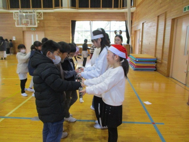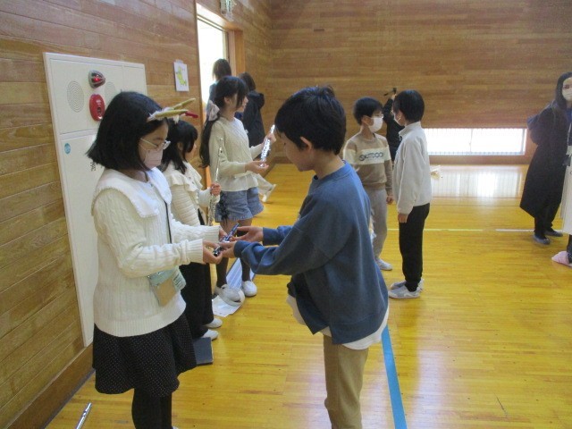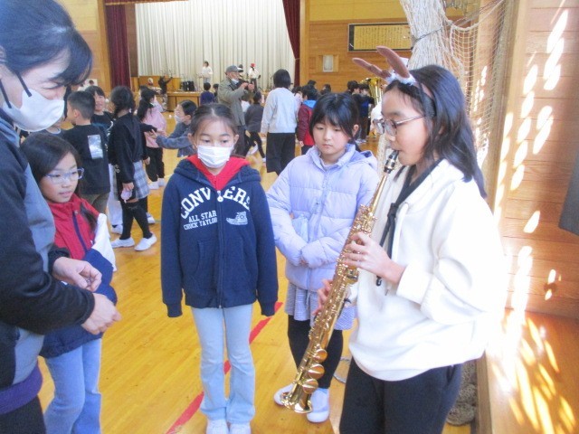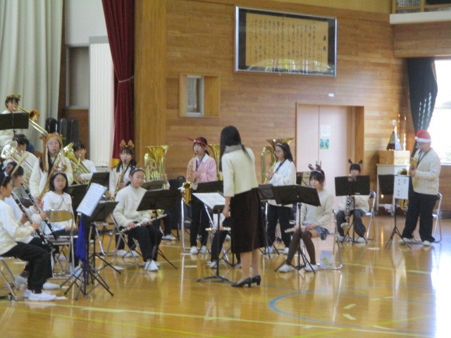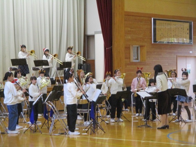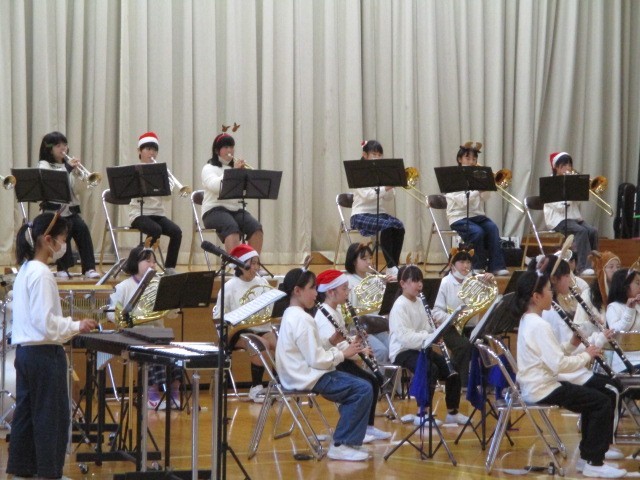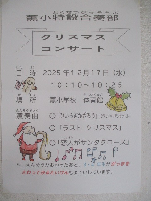 12月17日(水)、2校時目終わりの休み時間に特設合奏部がクリスマスコンサートを行い、クリスマスにちなんだ3曲を発表しました。体育館にはたくさんの薫っ子たちと職員、合奏部の保護者の方々もお集まりくださいました。合奏部の皆さんのすばらしい演奏に、会場からは手拍子や大きな拍手が送られていました。コンサートの後には、楽器体験も行いました。合奏部の皆さんの活躍と、薫っ子たちの笑顔が輝いていました。