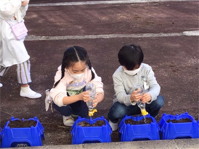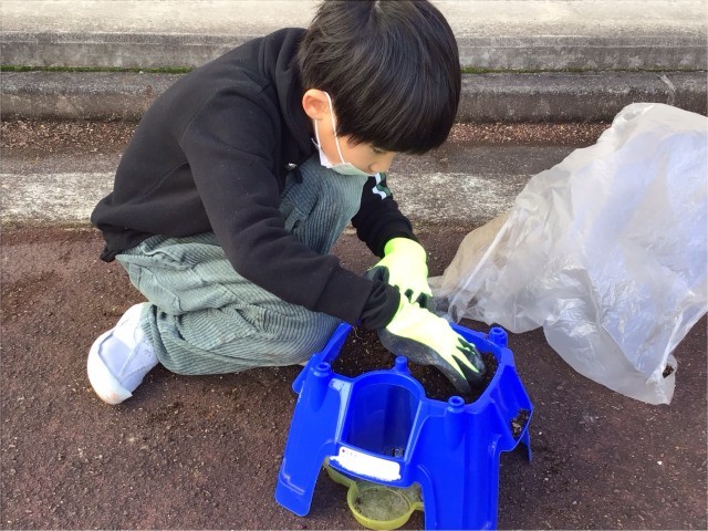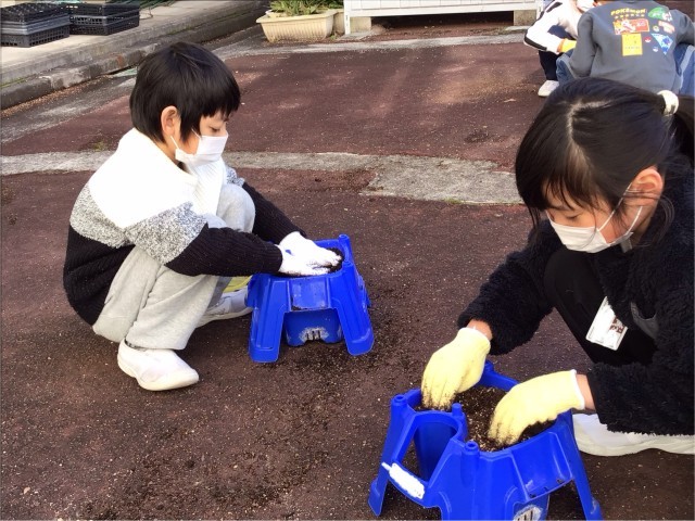 朝顔を育てた植木鉢に、春に向けてチューリップの球根を植えました。土を柔らかくしてから、球根の上下を間違えないように優しく植えました。色は、咲いてからのお楽しみです。子どもたちからは、「何色の花が咲くかな」「いつ芽が出るかな」「早く春にならないかな」などのわくわくした言葉がたくさん聞こえてきました。
