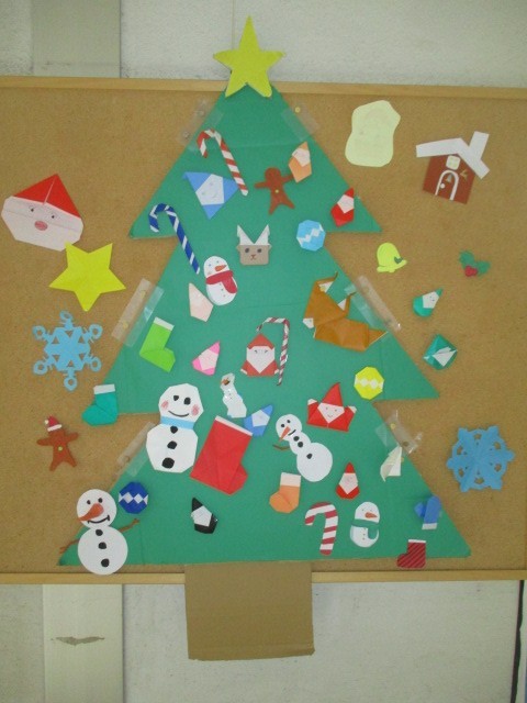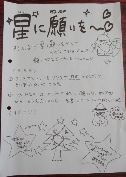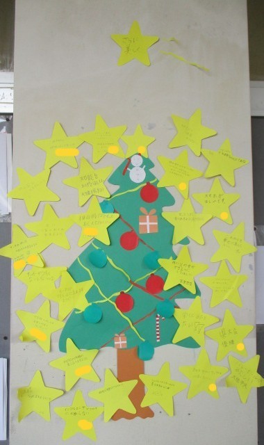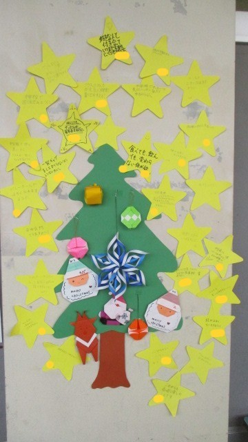 運営委員会が全校生に呼び掛けて行った「星に願いを」が学級ごとに廊下に貼り出されています。お星さま1枚1枚に、子どもたちや担任の願いが込められていました。掲示委員会が作ったクリスマスツリーも昇降口を飾ってくれています。