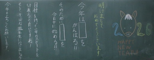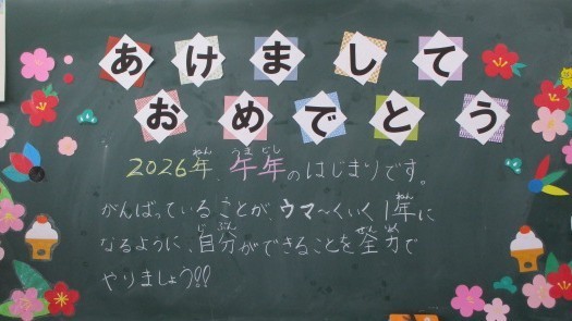 令和8年1月8日(木)、始業式の朝、各教室の黒板には、新たな年を迎えた子どもたちへ担任からのメッセージがいっぱいに記されていました。学校だよりにも紹介していますので、そちらもぜひご覧ください。