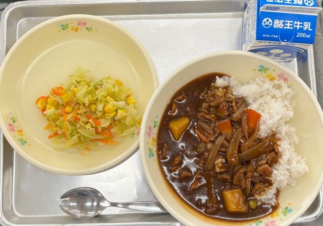 今日の給食は、ハヤシライス 牛乳 きゃべつとコーンのサラダでした。きゃべつは愛知県の春きゃべつが納入されました。緑色の葉の巻きがやわらかく、サラダにする前からとてもおいしそうなきゃべつでした。にんじんは千葉県産、ホールコーンは北海道産の冷凍コーンを使用し、りんご酢で爽やかな風味にしました。野菜は、ビタミンなどの栄養を吸収した後に残る食物繊維のはたらきで、腸内環境を整える効果があります。肉類や油っぽい料理を食べた時は、たっぷりと野菜を食べて胃腸の調子を良くしましょう。