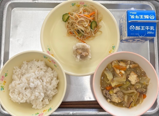 今日の給食は、麦ごはん 牛乳 しゅうまい はるさめのごま酢あえ ホイコーローでした。中華料理の献立の中で、ホイコーローは、甜面醤を使って、甘辛い味に仕上げた四川料理の一つです。回鍋とは、鍋を回すことではなく、一度調理した食材を鍋に戻し入れて仕上げる料理と言われています。給食では、豚肉を炒めてから野菜類を加えて味付けしています。給食の回鍋肉なので、味つけは濃すぎず、食べやすく仕上げています。