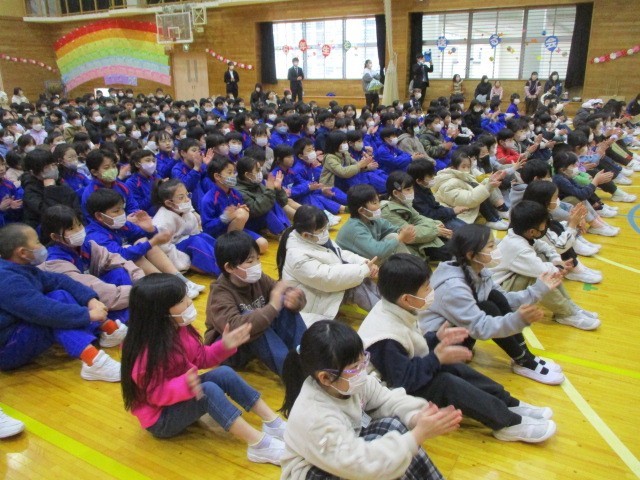 2月26日(木)、業間休み時間に特設合唱部の「おさそいコンサート」が行われました。特設合奏部の皆さんは、美しいハーモニーを体育館いっぱいに響かせてくれました。歌声とともにかっこいいダンスも披露してくれました。体育館に集まった全校生から、大きな拍手がおくられていました。