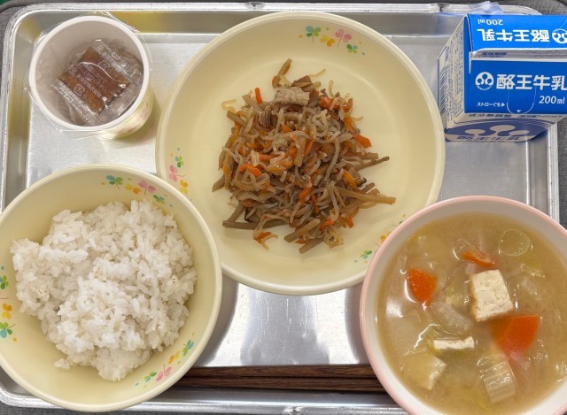 今日の給食は、麦ごはん 牛乳 納豆 五目きんぴら 生揚げのみそ汁でした。今日の給食には、納豆や生揚げ、みそなど大豆から作られる食べものが多く使用されていました。大豆は「畑の肉」とも言われ、良質なたんぱく質が多いので、私たちの体を作るもとになります。食物繊維も多いので、腸の中のお掃除をしてくれる働きがあります。昔から食べられてきた大豆です。健康維持のためにしっかり食べましょう。