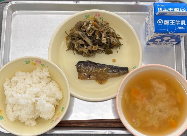 今日の給食は、ごはん 牛乳 いわしのごまみそ煮 刻み昆布の煮物 凍み豆腐のみそ汁でした。今日は、お彼岸献立で、昆布や油揚げ、凍み豆腐など、昔から食べられてきた食材を中心に作りました。基本的な和食で、ビタミンやミネラル、鉄分、カルシウムが多く健康的な組み合わせです。ご家庭でも和食中心の食事を心がけて健康な体をつくってほしいです。