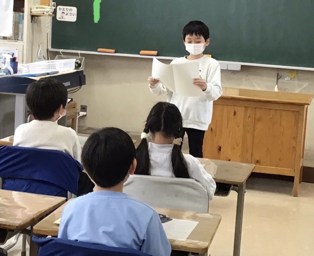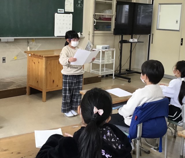今日は国語科「楽しかったよ、2年生」の発表をしました。1年間で心に残ったことを、話す速さや声の大きさに気をつけて話すことができました。どの子も生き生きと堂々と発表することができました。