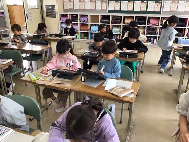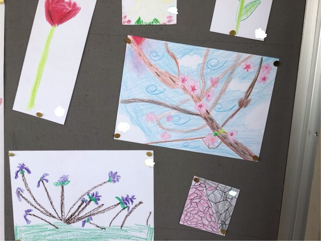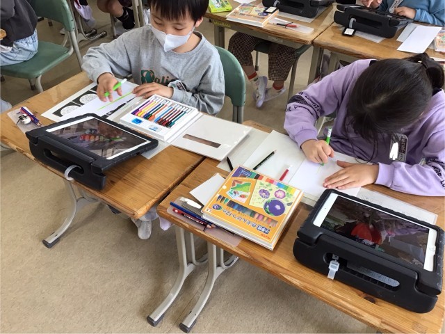 2年生最初の図工は、春を探しに校庭へ行きました。描きたいと思った春を写真に撮り、自分の感じた形や色で絵に表しました。友達と作品を見合いながら、見つけた春のよさを感じることもできました。