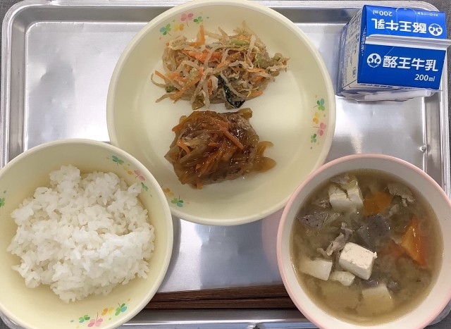 今日の給食は、ごはん 牛乳 ハンバーグの和風ソースかけ ごまあえ 豚汁でした。体の調子を整える効果がある食品をたくさん使いました。小松菜などの葉野菜、にんじん、ごぼうなどの根菜類、きのこ(えのきたけ)、豆腐など、食物繊維が豊富な給食でした。