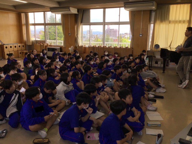 修学旅行の概要についての説明を聞いています。