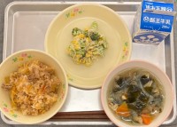本日の給食は、ごはん 牛乳 からしあえ じゃがいものそぼろ煮 青のり付き小魚でした。旬の食材のじゃがいもは、5月は長崎県産でしたが、6月になって茨城県産のじゃがいもが納入されるようになりました。来月には福島県内産が出回ることと思います。じゃがいもには、熱に強いビタミンCが多く入っていますので、エネルギー補給とともにビタミン補給にも効果的です。