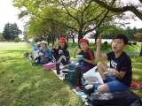 鶴ヶ城に到着し、お待ちかねのお弁当タイムです。 木陰に笑顔が溢れています。