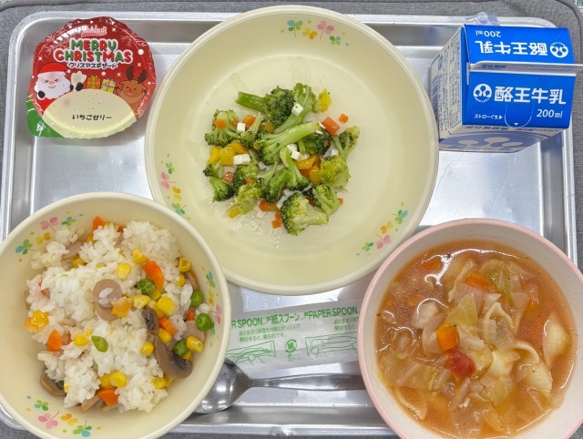 今日の給食は、コーンピラフ 牛乳 ブロッコリーサラダ ミネストローネスープ ク...