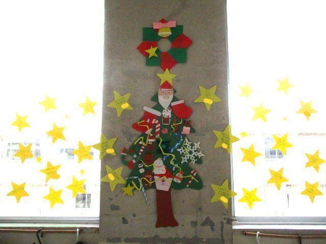 運営委員会が全校生に呼び掛けて行った「星に願いを」が学級ごとに廊下に貼り出され...