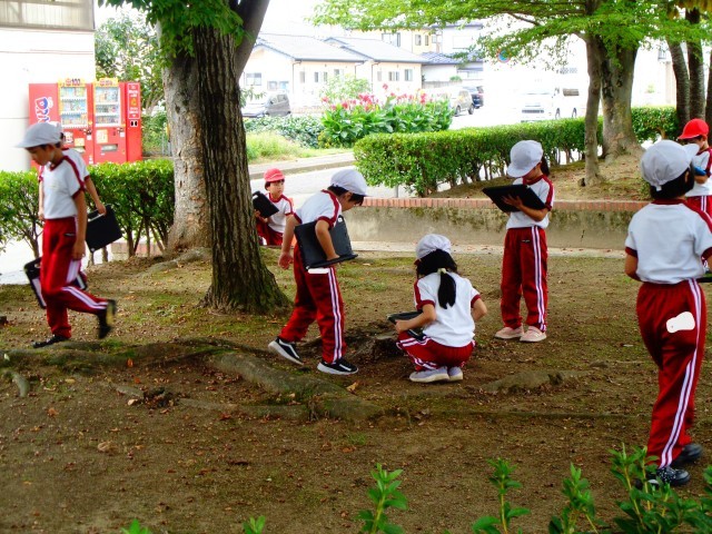 生活科「あきとなかよし」の学習で,島中央公園にて「秋探し」の活動を行いました。「わぁー,どんぐりがいっぱい落ちてる!」「ぼうし付きのどんぐりを見つけたよ!」「きれいな色の葉っぱがあったよ!」など,子どもたちは,友達と一緒に夢中になって「見付けた秋」の写真を,タブレット端末を用いて撮ったり,袋いっぱいに木の実を集めたりしました。また,夏に訪れた時と比べて葉の色が紅葉していることにも気付き,季節の変化を感じ取る姿が見られました。公園で集めた木の実は,「秋のたからもの」として,今後,生活科のおもちゃ作りの学習活動で活用していきます。保護者の皆様には,レジ袋の準備等ご協力いただきありがとうございました。
