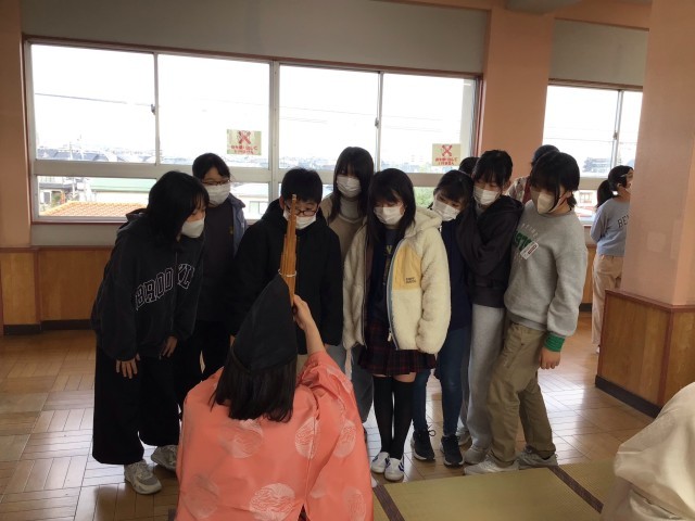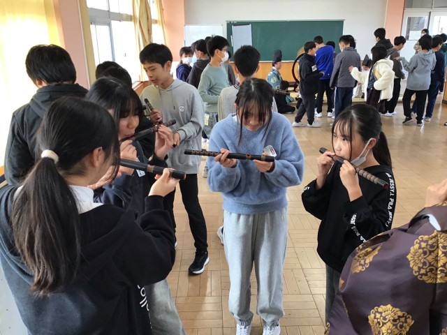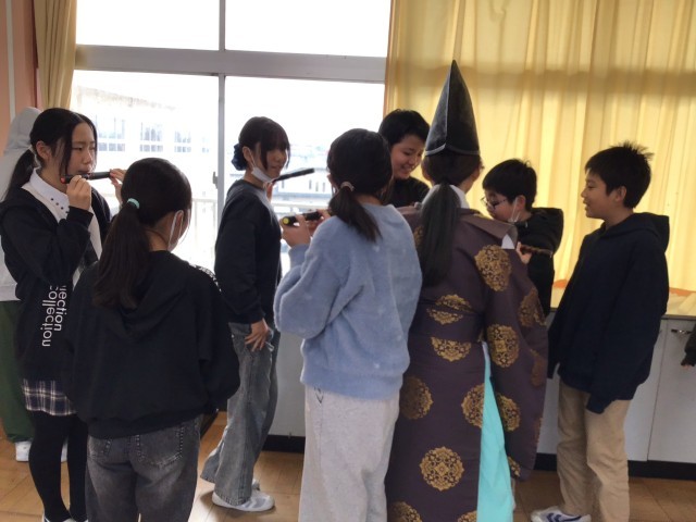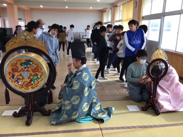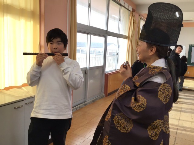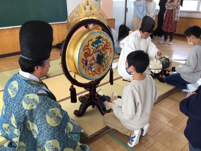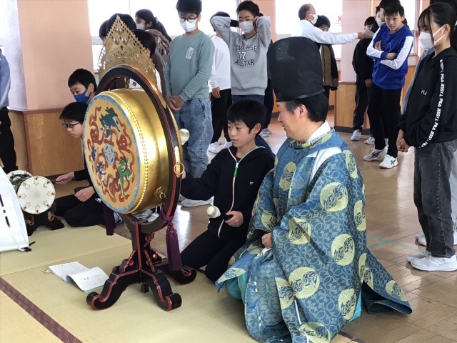 福島県雅楽会から6名の方に来校していただき、雅楽教室を行いました。初めに、「越天楽」の演奏を聴き、次に各楽器の紹介をしていただきました。そのあと、自分が興味のある楽器の演奏方法を教えていただきました。最後に「陪臚」という曲を聴きました。子どもたちは初めて雅楽に触れ、真剣に演奏を聴き、楽しそうに楽器の演奏に取り組みました。とても貴重な体験になりました。