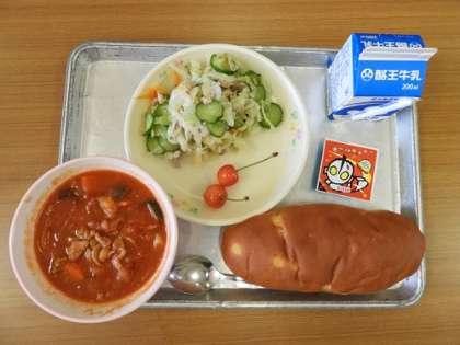 今日の給食は、パインパン、牛乳、ポークラタトゥーユ、フレンチサラダ、チーズ、さくらんぼです。