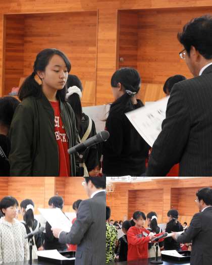 ソフトボール投げ組5位の阿部(衛)君、800メートル走組5位の高橋(来)さん、80メートルハードル組2位の根本(華)さん、走り幅跳び組3位の佐久間(心)さんに賞状を伝達しました。
